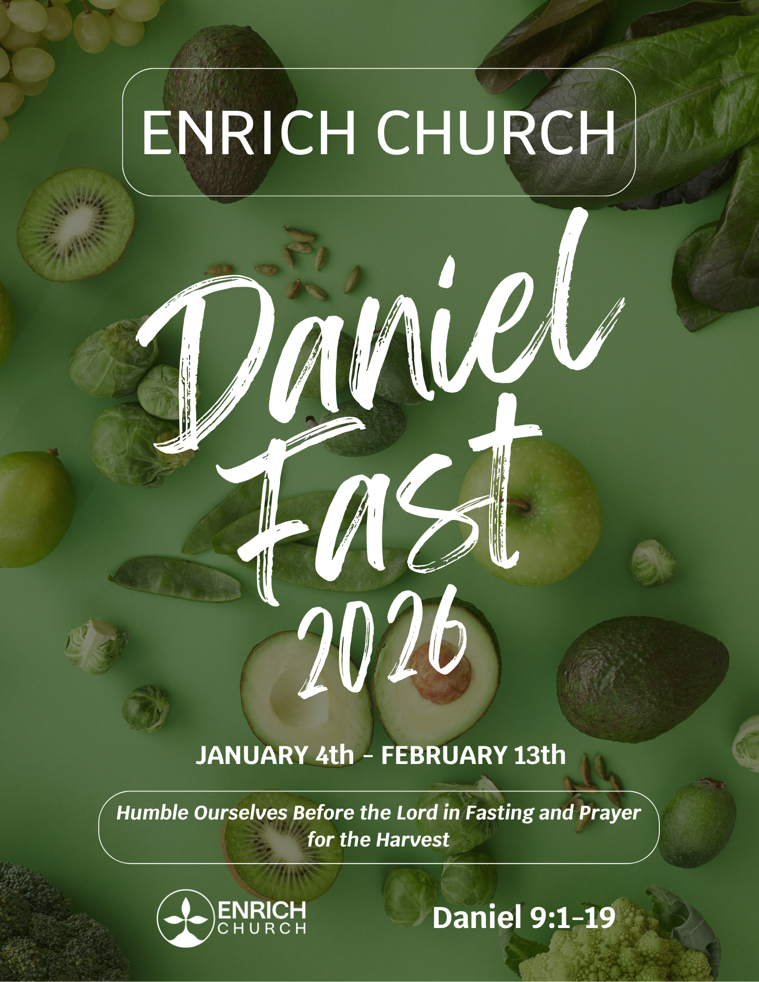 Welcome to the Enrich Church 2026 Daniel Fast! This fast is specifically designed to align with our yearly church-wide Daniel Fast. Daniel humbled himself before the Lord in fasting and prayer to fulfill God’s Word for Israel through repentance, intercession, and obedience. In the same way, our corporate fast will establish God’s will for the harvest: salvations, baptisms, and the multiplication of disciples and churches. Fasting is expected by Jesus (Matthew 6:16) and corporate fasts are called by Kingdom leaders (Ezra 8:21-22).