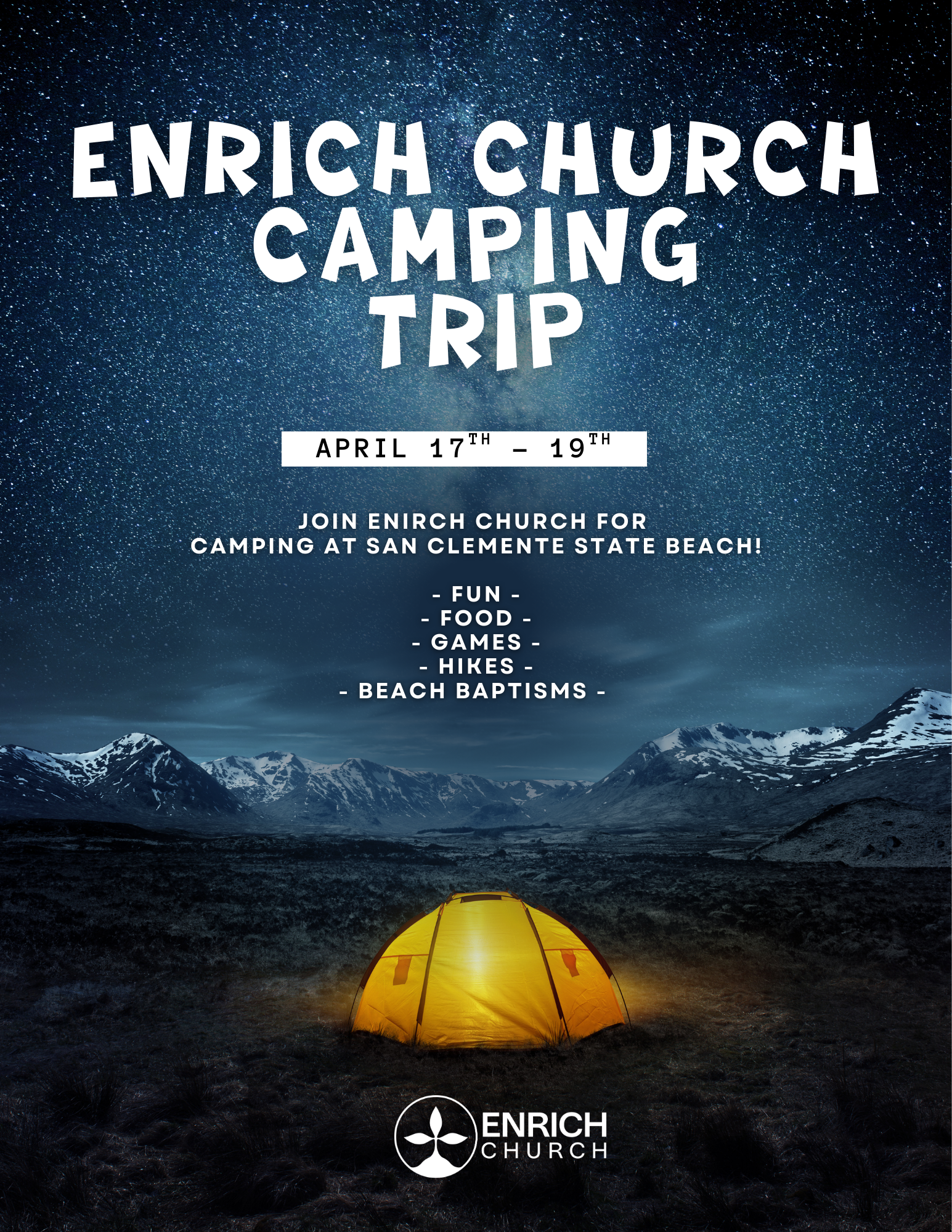Join us for Enrich Church's first camping trip! We will be camping at San Clemente State Beach at the group campsite that overlooks the ocean. This is probably one of the best camp sites in California!