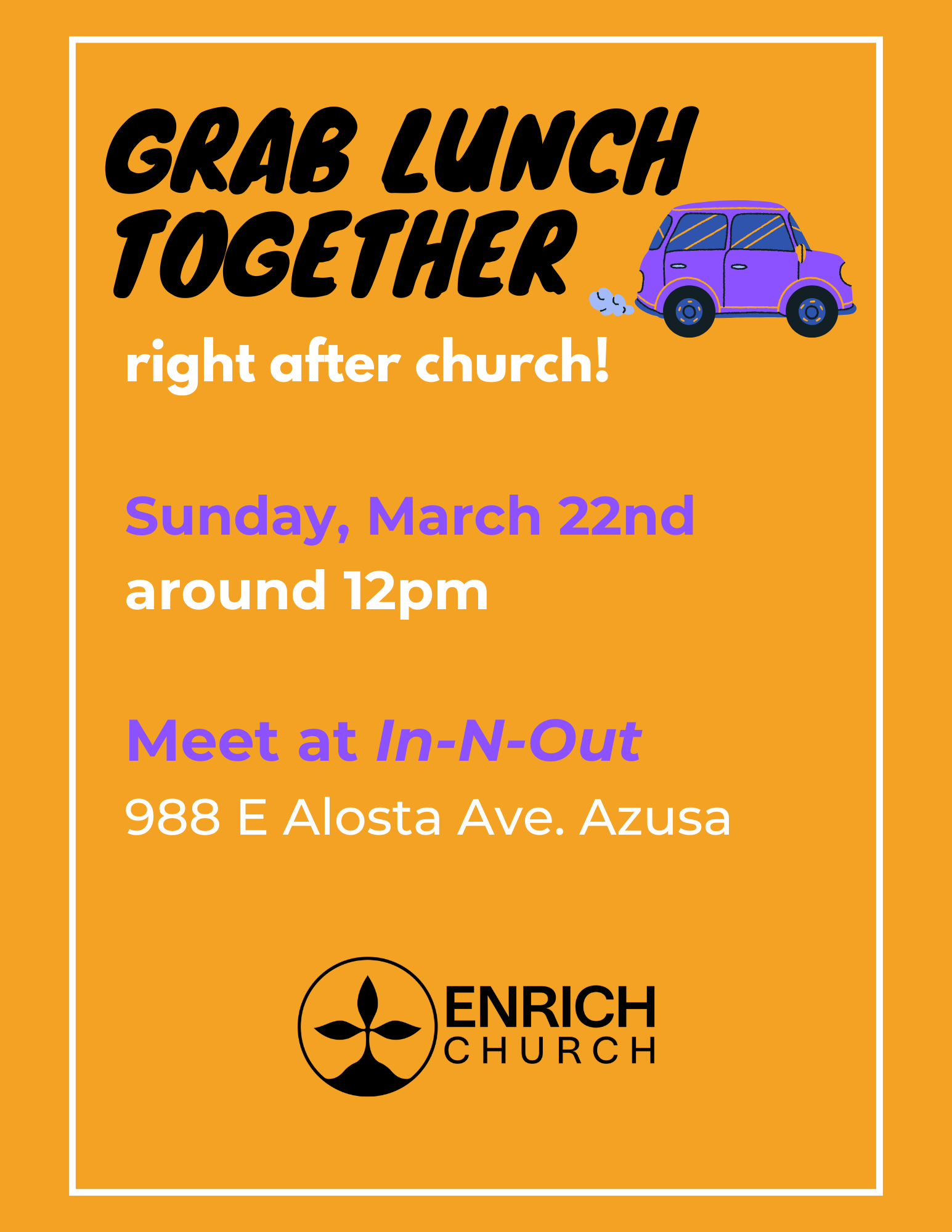 We'll meet at In-N-Out (988 E Alosta Ave, Azusa) about 12pm. Please purchase your own food and grab a seat with everyone!
