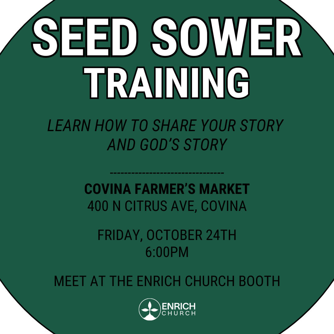 Join Enrich Church for Seed Sower training at the Covina Farmer's Market! We will train in a simple way to share your Jesus story, God's Gospel story, and give an invitation to believe in and follow Jesus. First time? No worries! All are welcome and there's a place for everyone to learn where they're at.